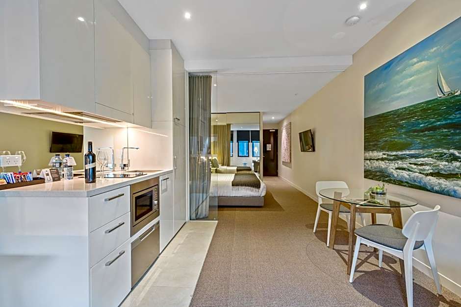 The Executive Studio features a comfortable queen bed, apartment-controlled air conditioning, modern kitchenette equipped with cooktop, bar fridge, toaster, kettle and microwave, plus modern private bathroom with all your amenities. Also included is a work desk, high-speed internet access and LCD TV.